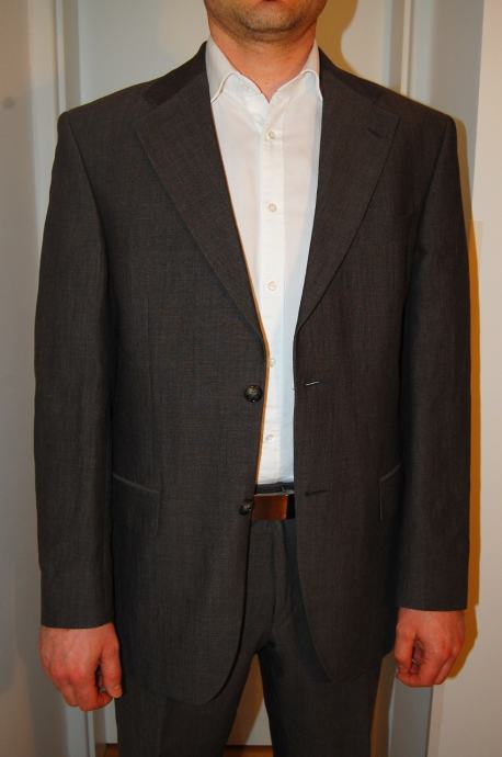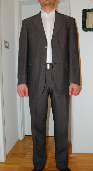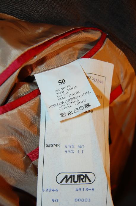 Sivo, prekrasno, laneno odijelo, malo nošeno, izgleda kao novo, Mura. Br. 50, ali komotno, prošlo bi i pod 52 - muškarac na slici je 182 cm i 82 kg. Sastav 55% lan, 45% vuna.