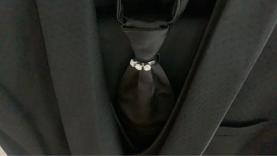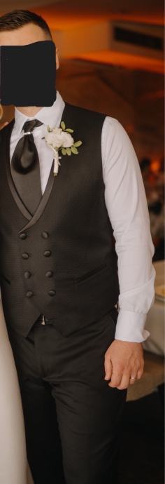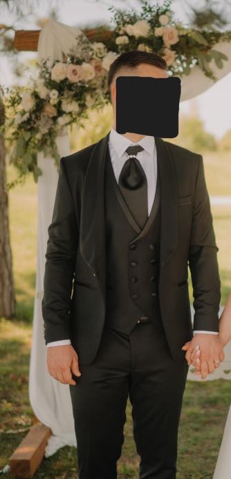 Svecani crni smoking iz Perrina, kupljen u 2/2024, jednom nosen. Sastoji se od sakoa, prsluka, kravate s prstenom i hlaca. Sako i prsluk br. 52. Odgovara visini od 180 cm i 85 kg. Kemijski ociscen, bez ostecenja i mrlja. Placen 1000 eura s popustom.