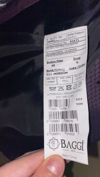 Odijelo se sastoji od sakoa, prsluka, hlača i leptir kravate. Materijal 70% viskoza, 30% poliester.