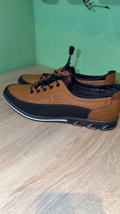 Prodajem muške cipele od prave kože u smeđoj boji, veličina 45. Cipele su nove bez etikete, s crnim detaljima i bijelim dekorativnim šavovima. Izrađene od kvalitetne kože, sportsko-elegantnog stila s vezicama. Udobne i praktične za svakodnevno nošenje.
