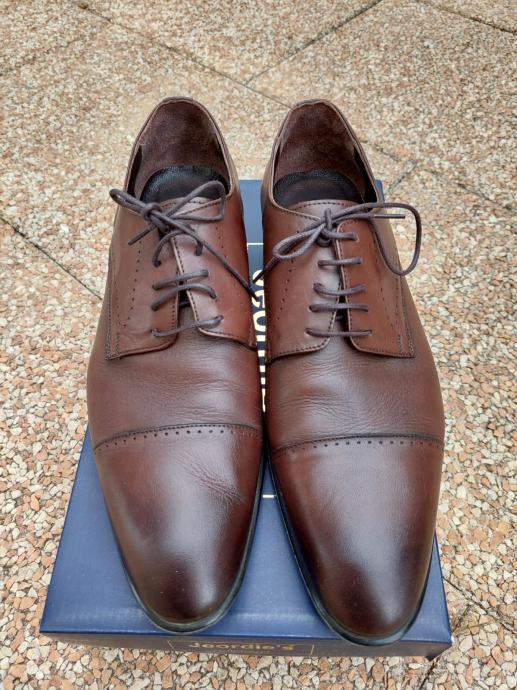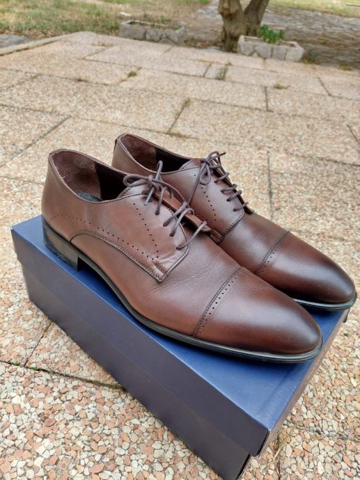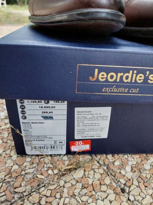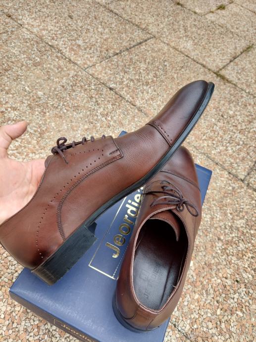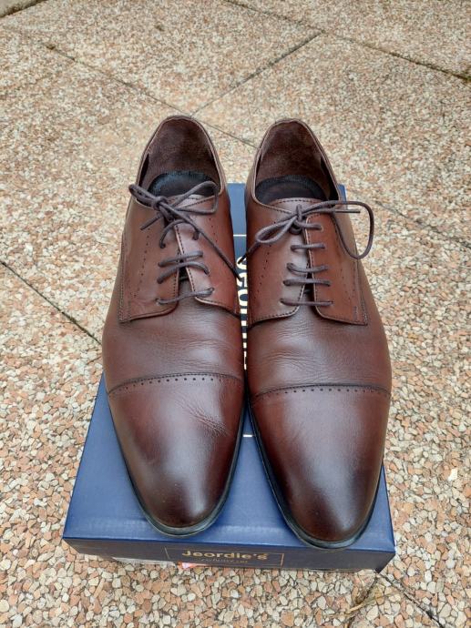 Prodaju se samo jednom nošene (na par sati) kožne smeđe muške cipele kupljene u Jeordie's-u. Cipele su vrlo kvalitetne i udobne. Deklarirana veličina 44, no odgovaraju većem broju (otprilike 45-45,5), potrebno provjeriti mjere. Unutarnje gazište od početka špice do kraja pete cca 30,5 cm.