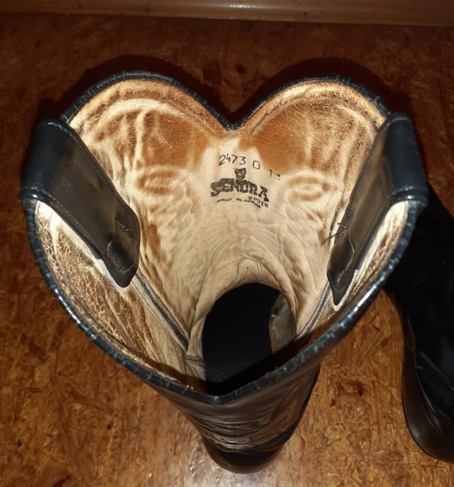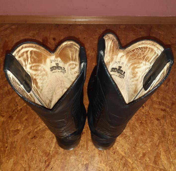 Kaubojke čizme "Sendra", ( Made in Spain ) br. 44, potpuno od kože ( Koža izvana, koža iznutra, kožni đon I drvena peta ) Čizme su "Gaucho" model, anatomski savršeno napravljene, izuzetno udobne ali nisu u idealnom stanju i vide se tragovi nošenja i vremena (vidljivo va slikama). Prodaja, isključivo, putem pouzeća ili osobno preuzimanje na adresi