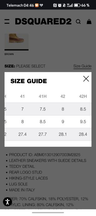 vel 41 (po katalogu Dsquared2 gaziste cca 27.4 cm znaci 42 cipela ili adidas 43 1/3)
