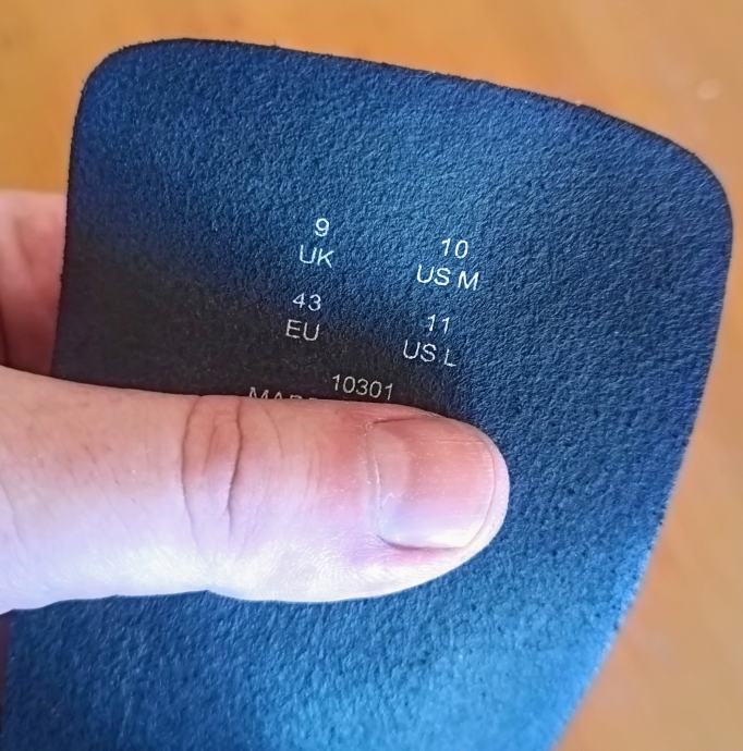 Mjere: unutarnja duljina 27,1 cm. Ako nosite veličinu 43 ima dovoljno mjesta do čeličnog vrha. Širina stopala 9,4 cm, opseg stopala 24,4 cm