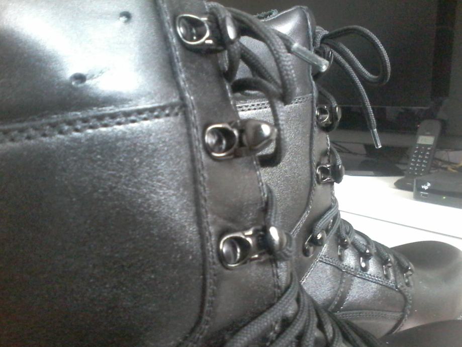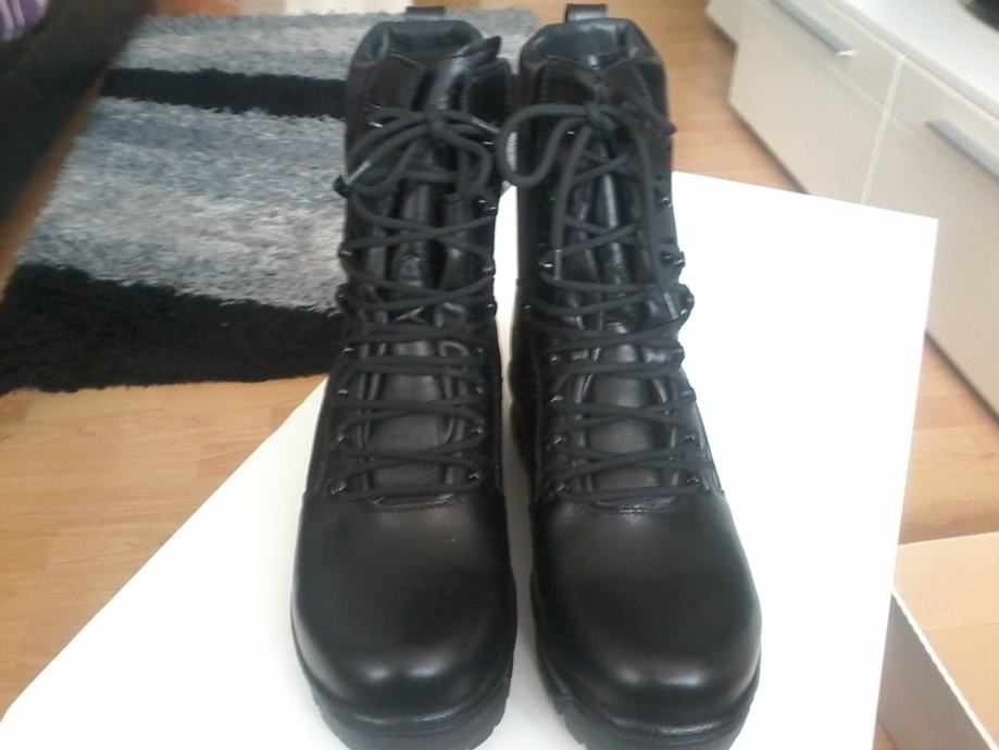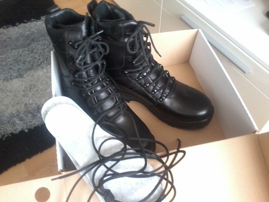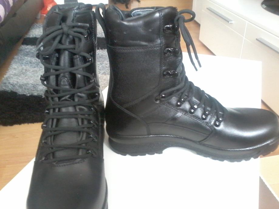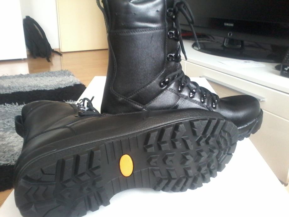 Nove zimske vojne čizme broj 46. Izrađene od prirodne kože, đon je od gume što pridonosi stabilnosti na klizavim podlogama kao što su led i blato. U komplet idu rezervni ulošci i vezice (žniranci).