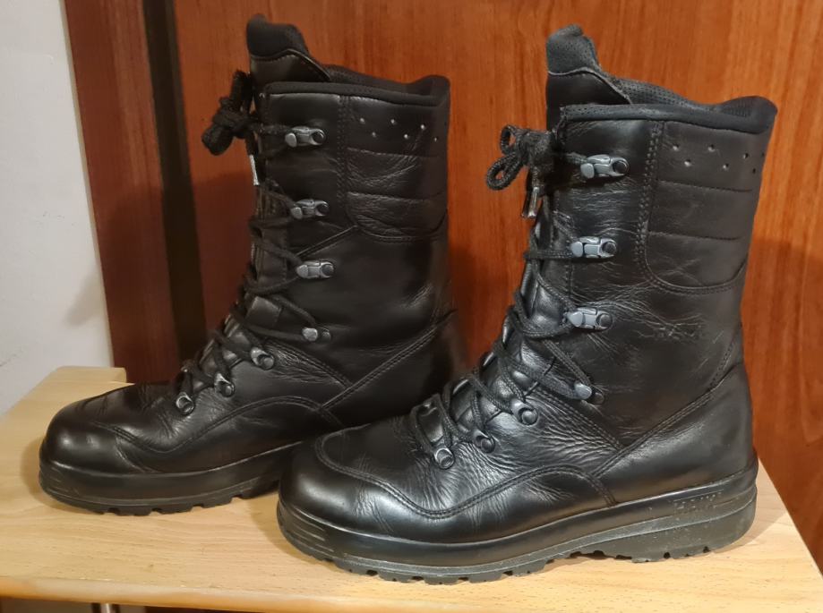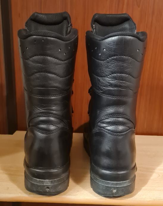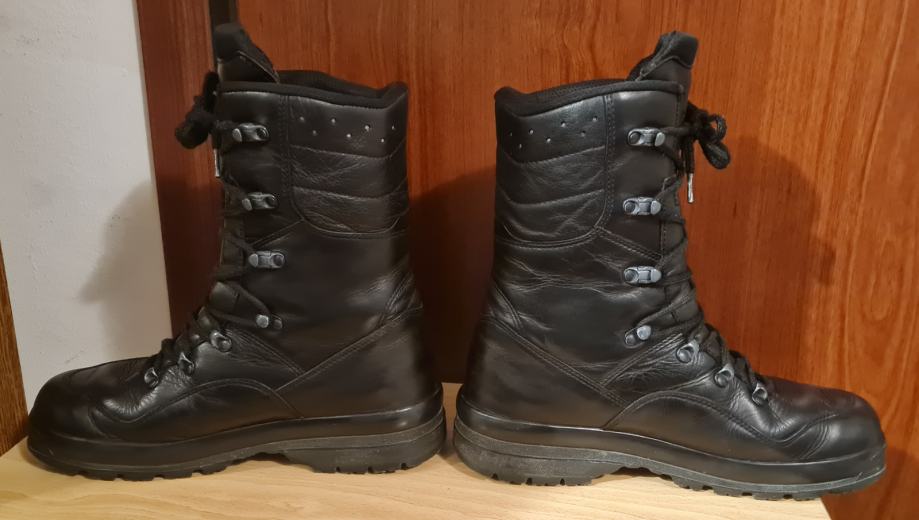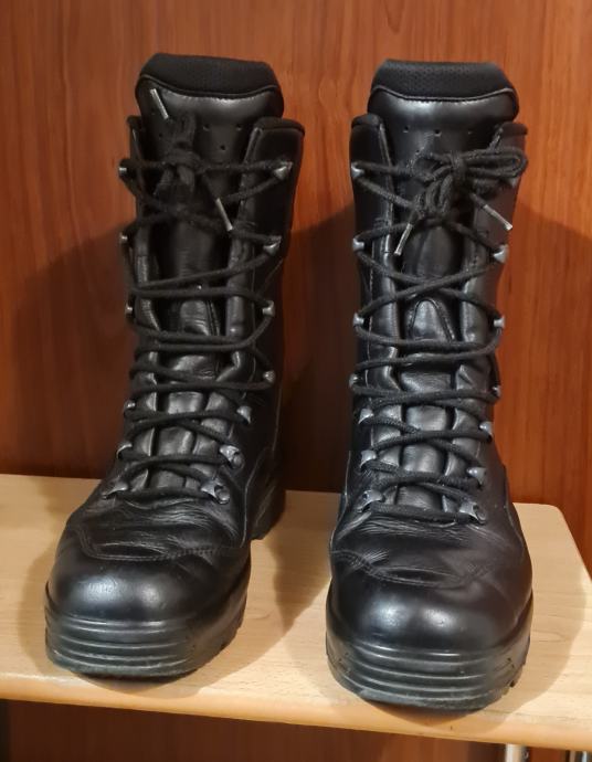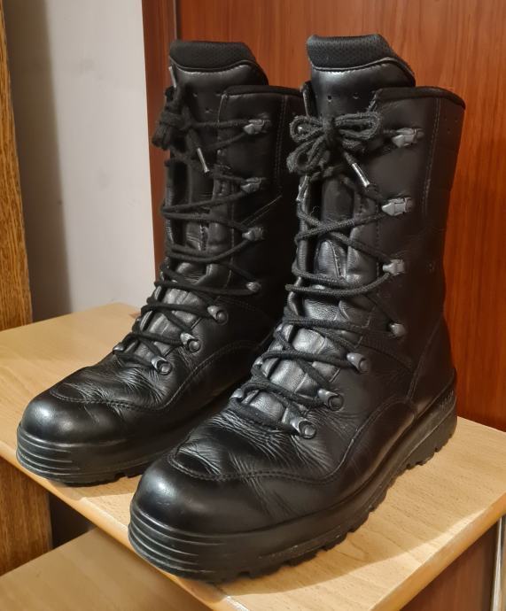 Visokokvalitetne vojne čizme crne boje, izrazito ugodne, imaju kožno gornjište iznimne kvalitete u izvedbi glatke kože, šok apsorbirajuću mobilnu uložnu tabanicu (perivu), antibakterijsku višeslojnu podstavu s goretex membranom, protuklizne potplate. Proizvedene u Njemačkoj.