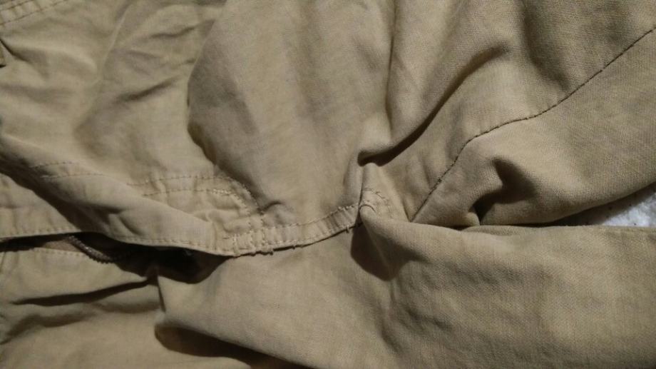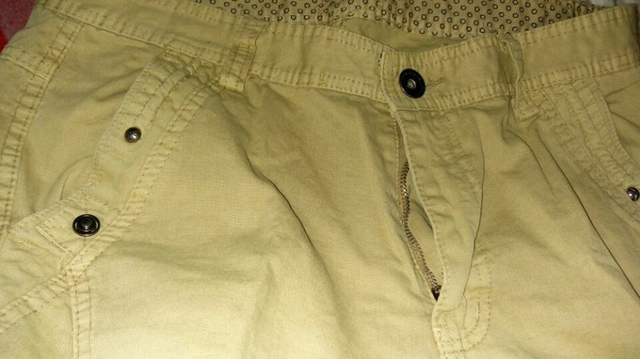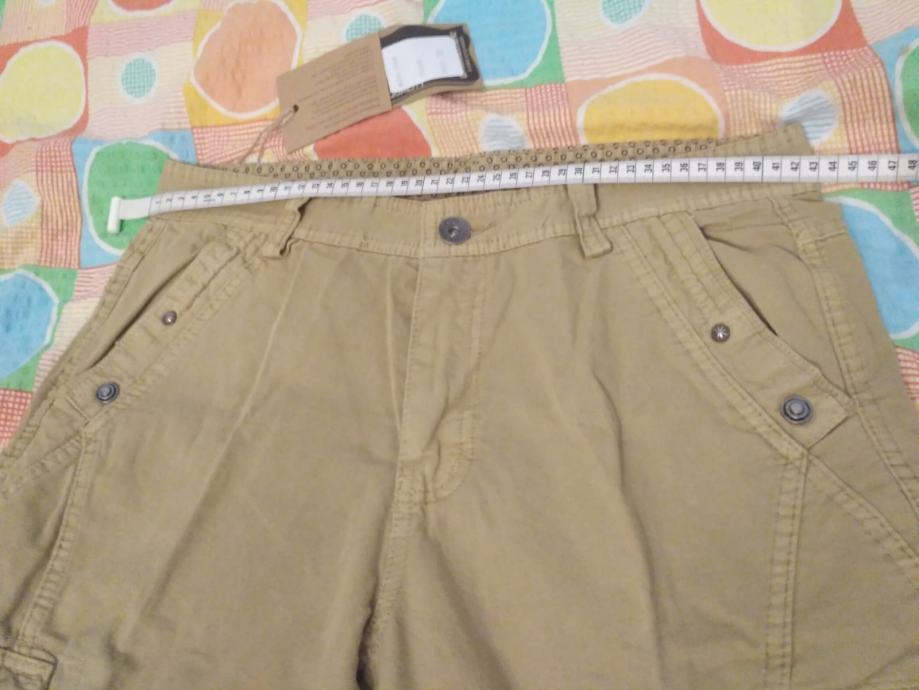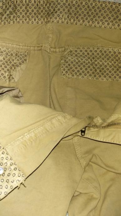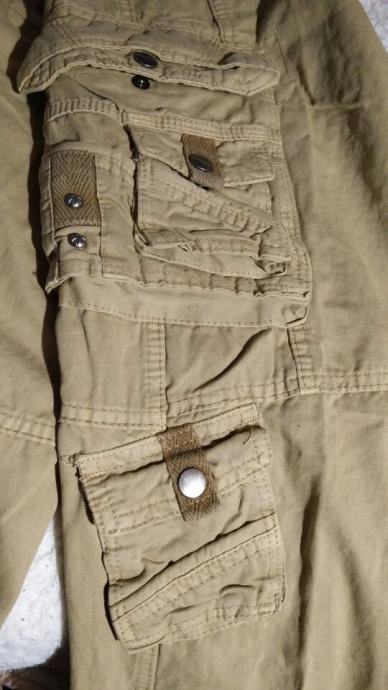 Cargo vrećaste traperice, military stil, sa džepovima na nogavicama, khaki boje, debeli, čvrsti materijal, šavovi. Širina struka je 86 cm, dužina je 113 cm (za osobu visine do cca 182cm, 75-80 kg).