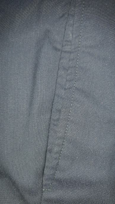 Mjere: obim struka 96 cm , dužina nogavice 110 cm, dubina 34 cm, unutarnja nogavica 84 cm. Boja sivo-plavo.