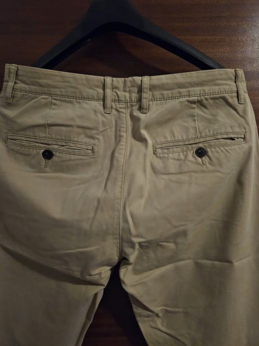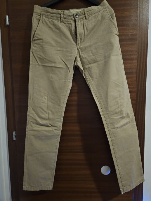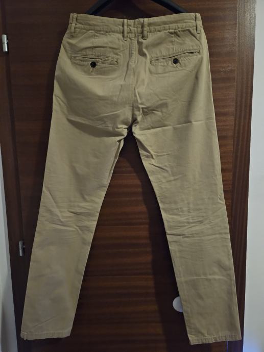 Prodajem muške hlače u bež boji, veličina 30. Hlače su 100% pamuk, što ih čini udobnima za nošenje. Klasičan chino kroj s dva džepa sprijeda i dva na stražnjoj strani s gumbima. Hlače su skoro nove.