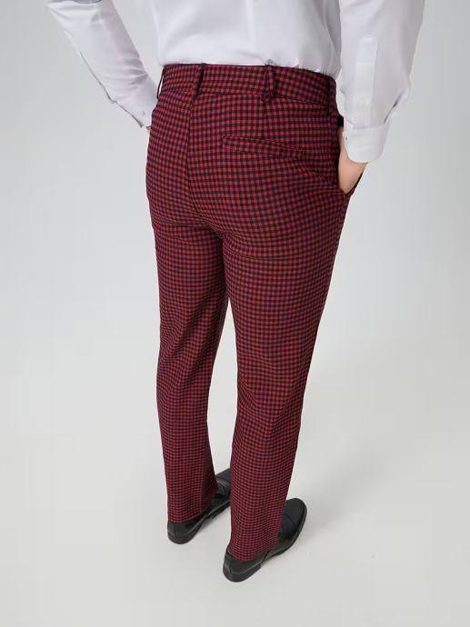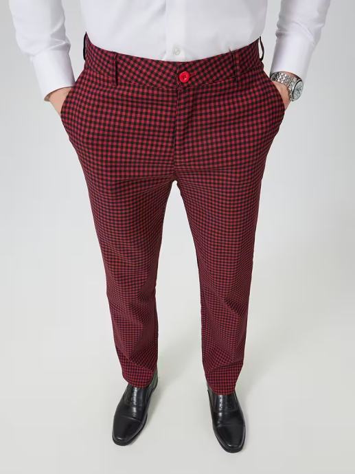Muške nove poslovne modne udobne banketne četverogodišnje tkane hlače vino crvene boje s kariranim prugama, ukrasnim džepovima, obične gumbiće, ležerne hlače
