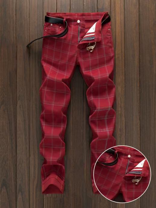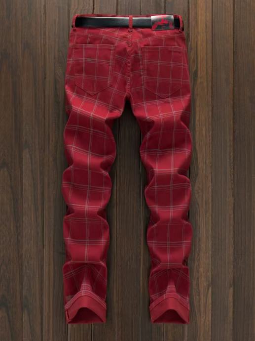 Muške uske karirane hlače - ležeran retro stil, lagana rastezljiva tkanina, crveno-bijeli karirani uzorak, zatvaranje patentnim zatvaračem, nošenje za sva godišnja doba, svestrane za poslovnu i ležernu odjeću, elegantne hlače za posao, poslovno ležerna odjeća, moderan uski kroj, izdržljiva tkanina.