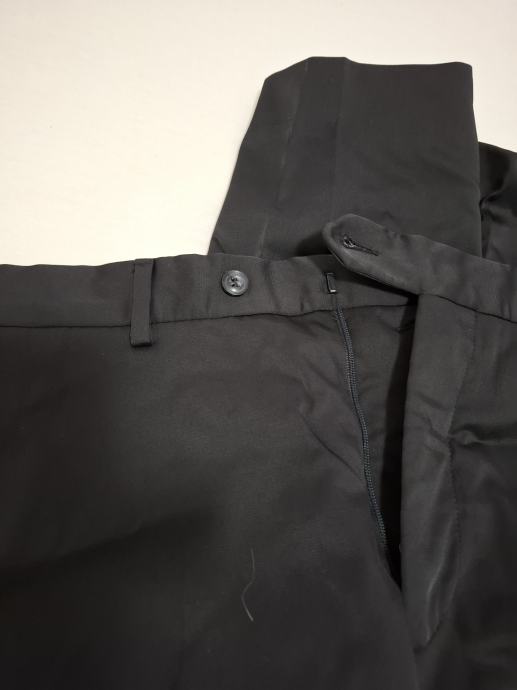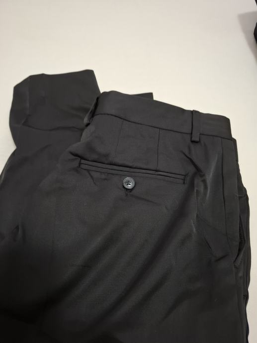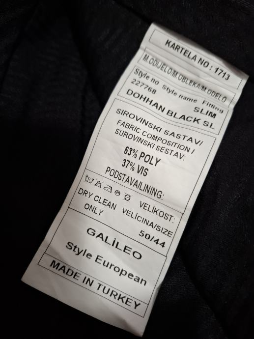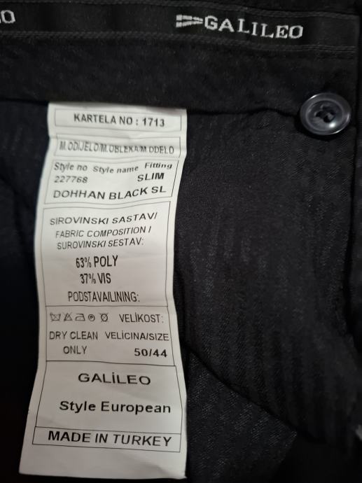 prodajem jednom obučene crne boje svečane hlače, marke Galileo, vel. 44, sastav 63%poliester, 37% viskoza. Mjere: širina struka 43cm, dužina nogavice s vanjske strane 105cm, širina nogavice na dnu 19cm.