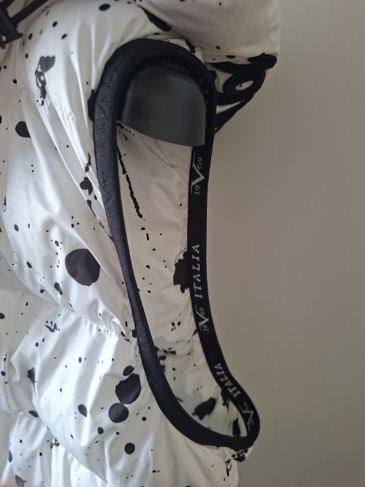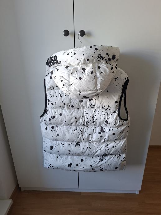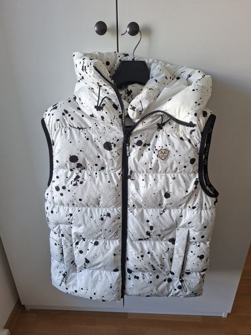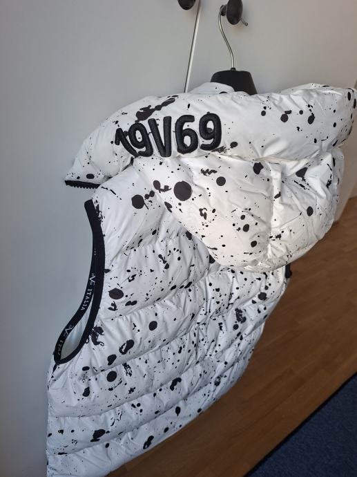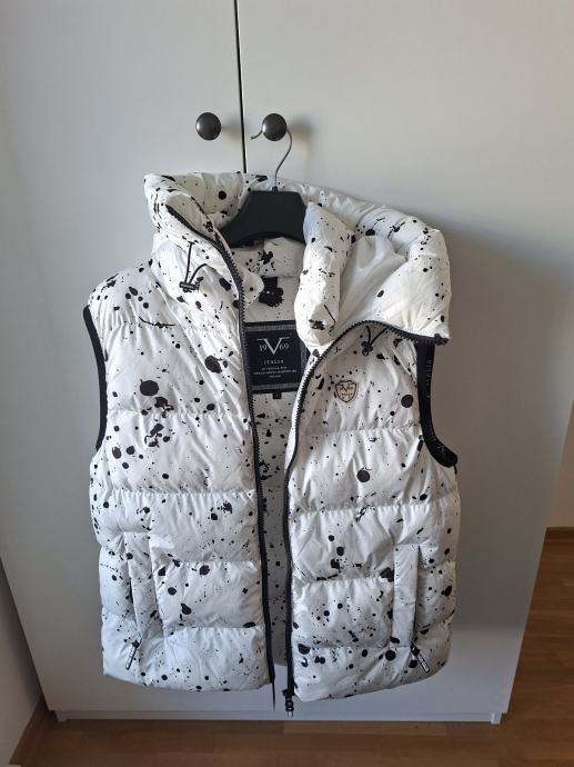 Elegantan muški prsluk brenda 19V69 Italia by Versace 1969 u bijeloj boji s uzorkom crnih mrljica, veličine L. Prsluk je nov bez etikete, idealan za slojevito odijevanje u hladnijim danima. Kvalitetna izrada s prepoznatljivim logom brenda na prsima garantira udobnost i dugovječnost.