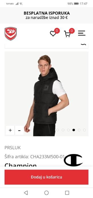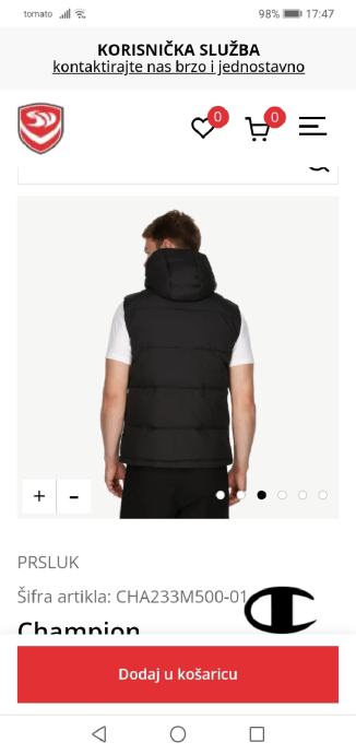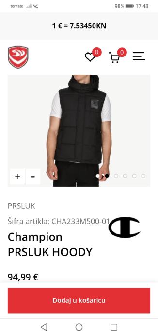 Prodaje se novi neraspakiran u orginal foliji prsluk- bezrukavnik marke champion kupljen u sportvisionu, crne boje velicina xxl, cijena u ducanu 95e sta je vidljivo na slikama, prodajem za 55 eura