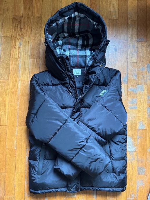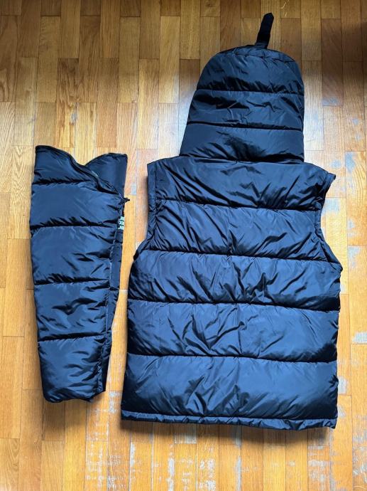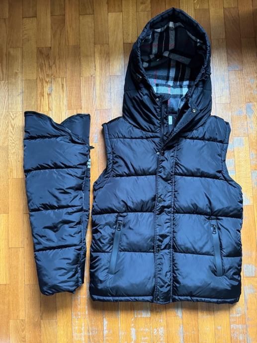 Prodajem Burberry puffer jaknu za muškarce, crne boje, s etiketom. Radi se o jakni s odvojivim rukavima, što znači da se može nositi i kao klasična jakna i kao prsluk s kapuljačom. Kapuljača je postavljena karakterističnim Burberry karirastim uzorkom, što daje prepoznatljiv detalj na inače jednostavnom dizajnu. Jakna je punjene, quilted konstrukcije koja pruža toplinu, a završna obrada i materijali su kvalitetni, kako se i očekuje od ovog brenda.