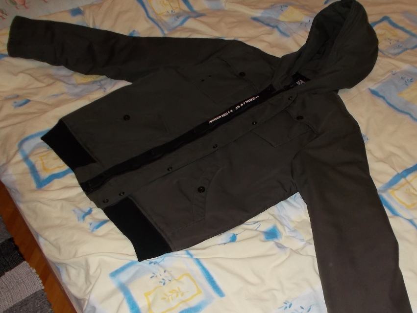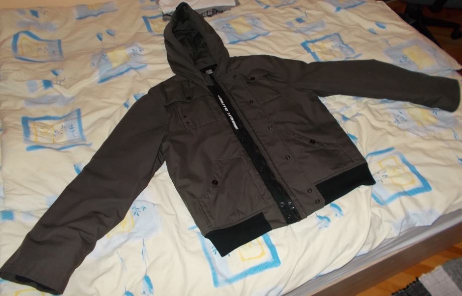 Pažnja: Jakna ima loš zibzar, tri zubca su otkinuta i teže se zakopčava preko zibzara. Može se zakopčati preko dugmadi (5 komada), mjenjati ili popraviti zibzar.