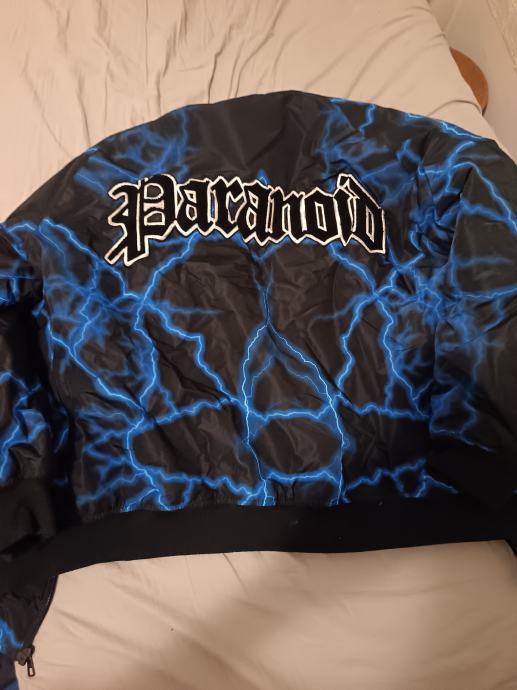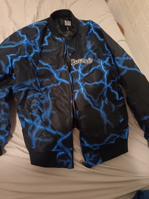Prodajem mušku jaknu bomber stila s efektnim dizajnom plavih munja na crnoj podlogi. Jakna je veličine L, nova bez etikete. Na prednjoj strani i leđima ima natpis "Paranoid".Classični bomber kroj s patent zatvaračem i elastičnim obrubima na rukavima i dnu. Crna boja s upečatljivim plavim detaljima.