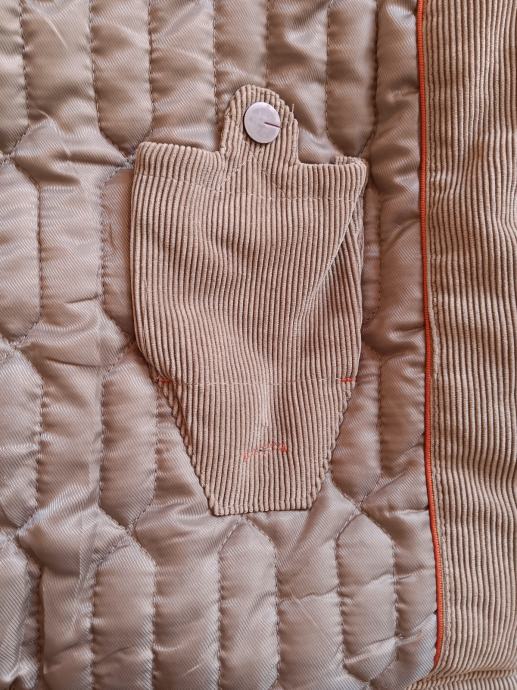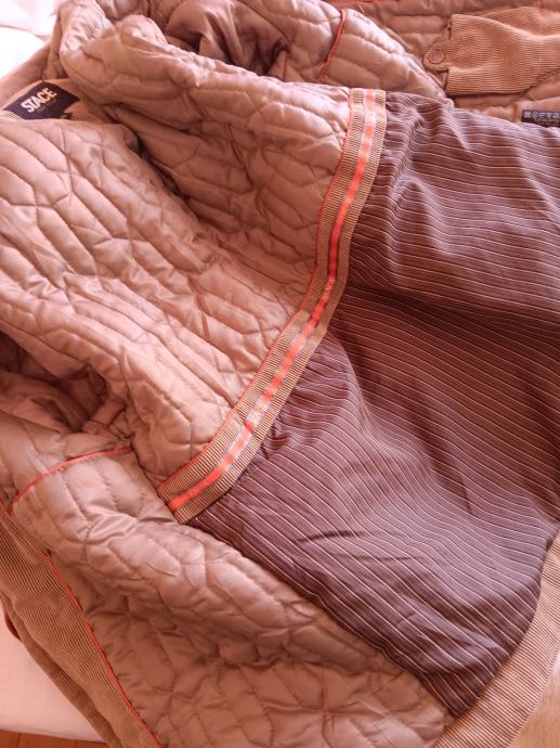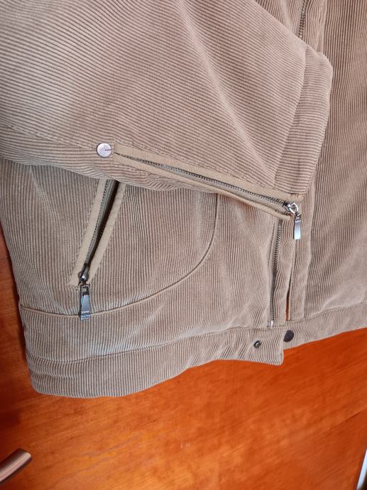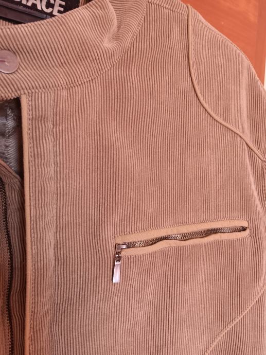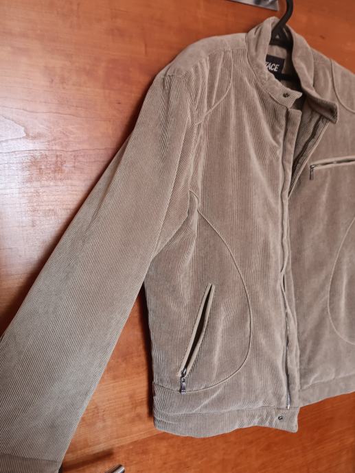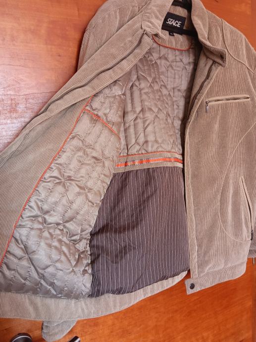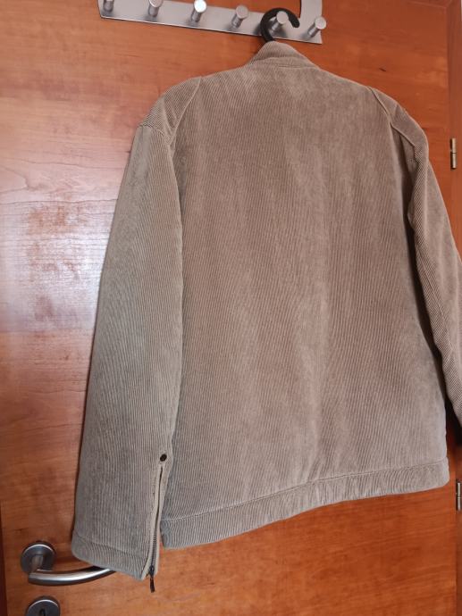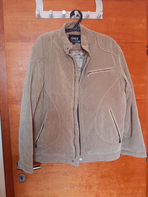 Muška jakna od samta, bež boje, broj cca L. Klasični kroj, 3 vanjska džepa, 3 nutarnja. Sastav: gornji dio 40% pamuk, 60% poliester; podstava: 68% pamuk, 32% poliester. Topla, podstavljena.