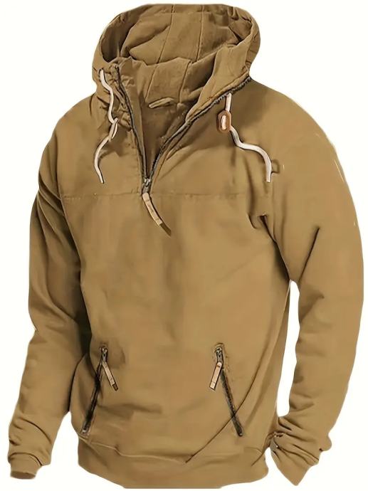 Muška jakna širokog kroja s kapuljačom i džepovima s patentnim zatvaračem - ležerna poliesterska majica za van, jednobojna smeđa boja, podesive vezice, više patentnih zatvarača, idealna za proljeće i jesen