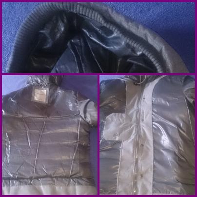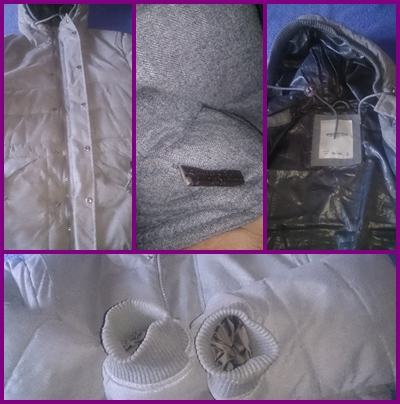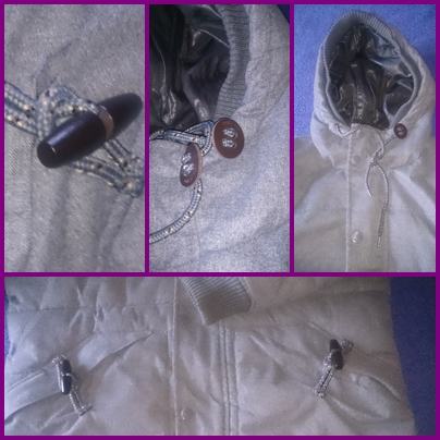 U ljubičastim okvirima su foto sa detaljima jakne: kapuljača sa elastičnim šiltom---gumbi steznici za kapuljaču---džepovi sa njihovim gumbima--lastika oko rukava---unutarnji džep, stanje podstave i dr.