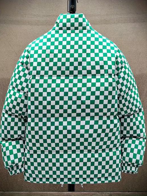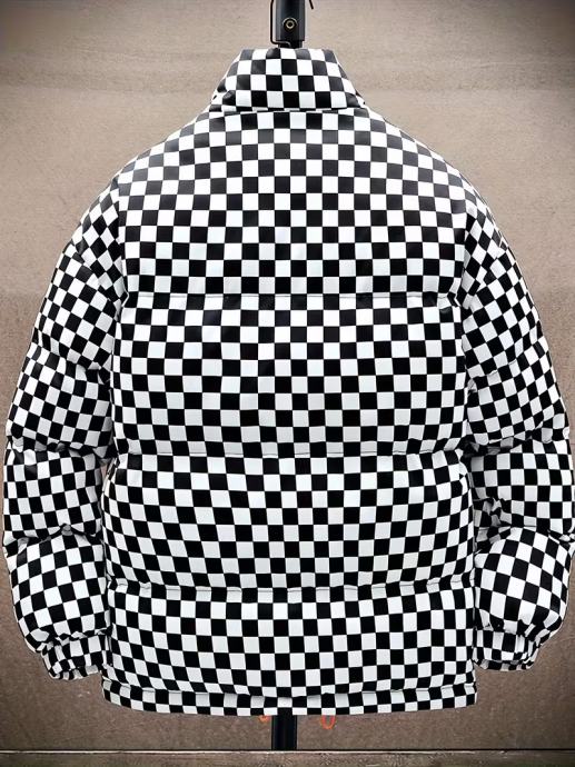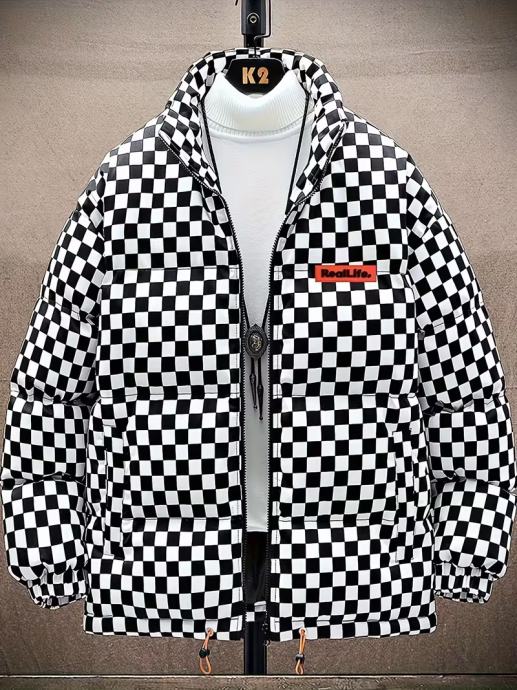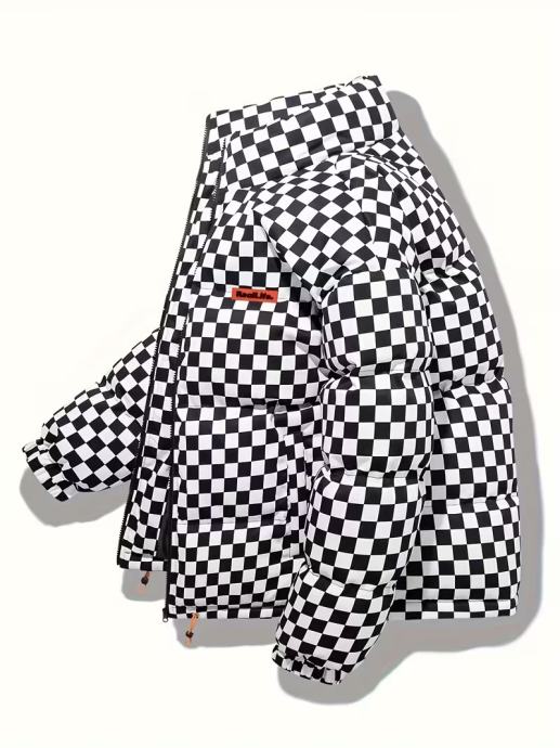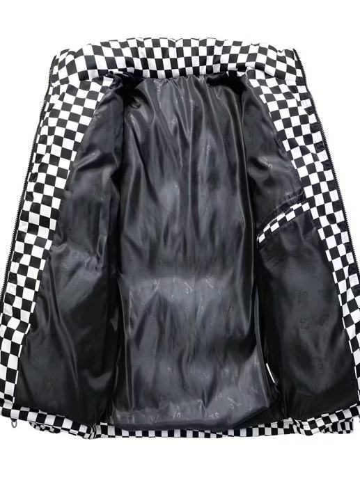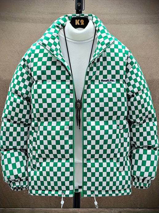 Muška karirana prošivena zimska jakna - Debeli izolirani kaput za uličnu modu s ovratnikom, patentnim zatvaračem sprijeda i podesivim manžetama s vezicama, zimska jakna