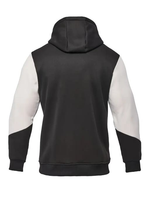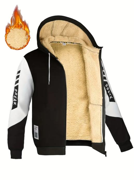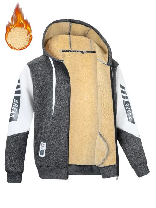 Muška termo jakna s kapuljačom i plišanim materijalom - zimski kaput s patentnim zatvaračem, bež i crni blok boja, perivo u perilici rublja, džepovi - ležerna gornja odjeća za hladno vrijeme (ne kemijsko čišćenje)