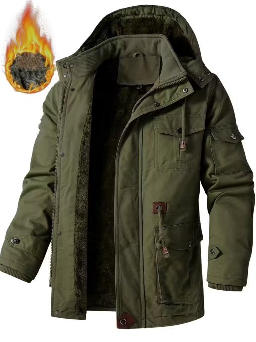 Muška zimska jakna za teške uvjete s kapuljačom na patentni zatvarač cijele duljine, stojećim ovratnikom i ležernom jaknom s više džepova za hladno vrijeme (pranje u perilici rublja, jesen/zima) - Jednobojni radni sako