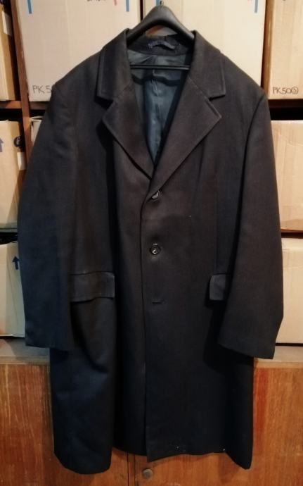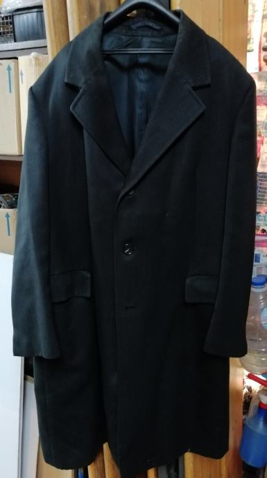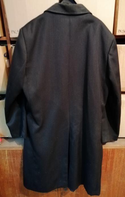Muški crni kaput (veličina 54-56, mjere; prsa od šava do šava ispod pazuha, zakopčani kaput 66cm, dužina od kragne, ramena do dna 110cm, širina ramena / leđa od šava do šava 52cm) kojeg bi trebalo odnjeti na kemijsko čiščenje jer je korišten, nošen (okovratnik), kojem treba prišiti jedno dugme sprijeda (a, koje je u unutarnjem đepu uz još jedno rezervno) i trebalo bi zašiti, promjeniti unutrašnjost đepova !