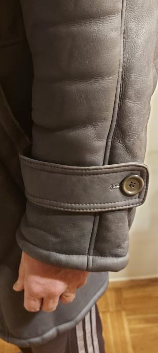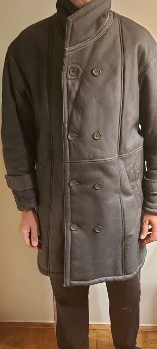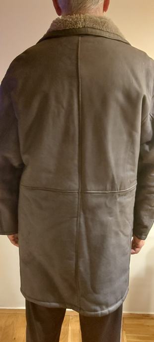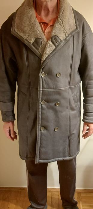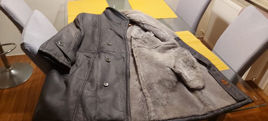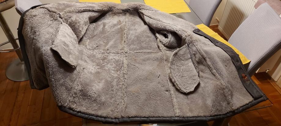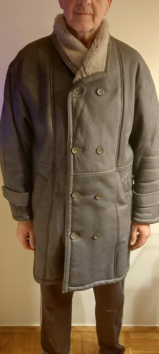Muška kožnata duga bunda, kompletno podstavljena sa ovčjim krznom, sive boje.
