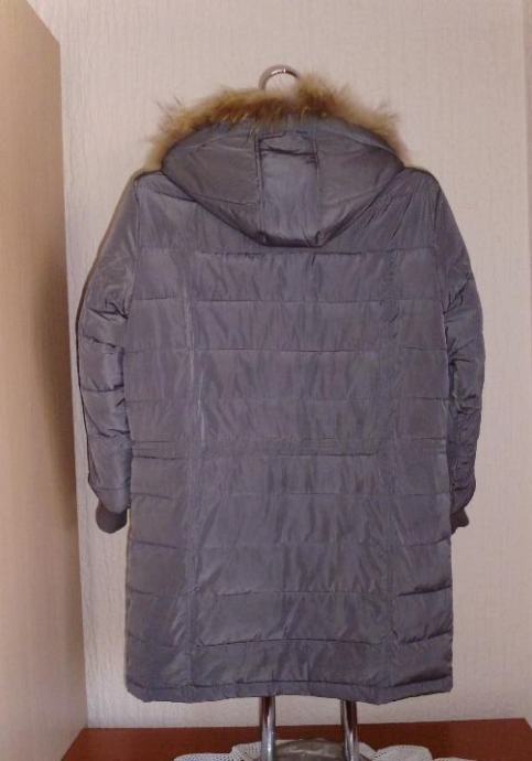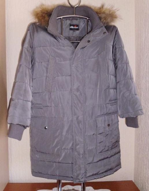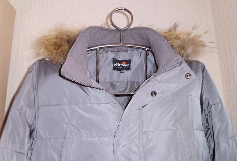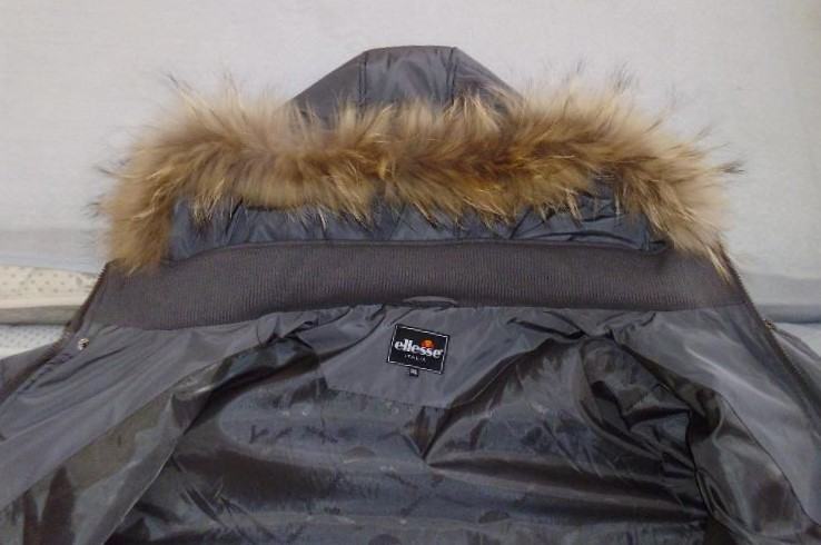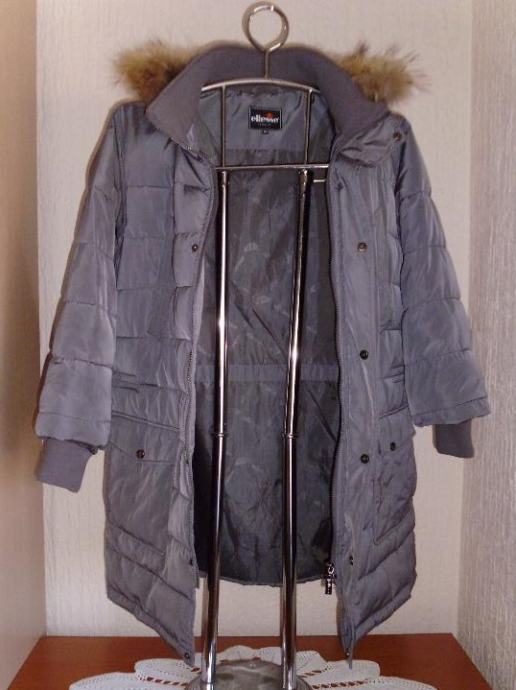 " Ellesse " muška zimska jakna XXL, sirovinski sastav 100% poliester, kapuljača sa pravim krznom koje se može skinuti kao i sama kapuljača. Jakna je tamno sive boje, ima šest džepova sa vanjske strane i jedan u unutrašnjem dijelu. U visini struka je gumica za zatezanje, kopčanje dvosmjernim patent zatvaračem i nitnama.