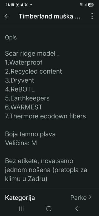 Prodaje se zimska Timberland jakna parka Scar ridge.Nova,samo jednom nošena,bez etikete.Veličina M, boja mornarsko plava.Detaljniji sastav i opis je u prilogu.Cijena je 180 eura.Cijena nove je 379 eura.