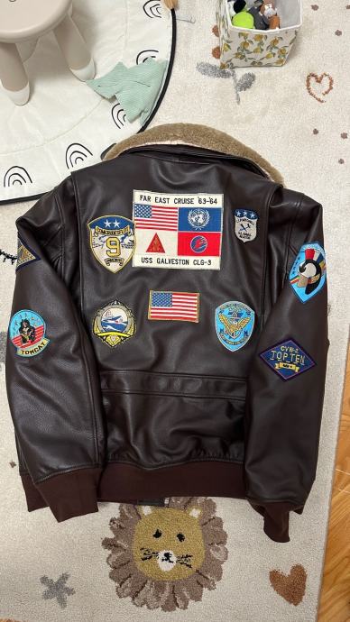 Godine 1986., vintage kožna pilotska jakna G-1 Navy prilagođena šarenim zakrpama za kultni film Top Gun.