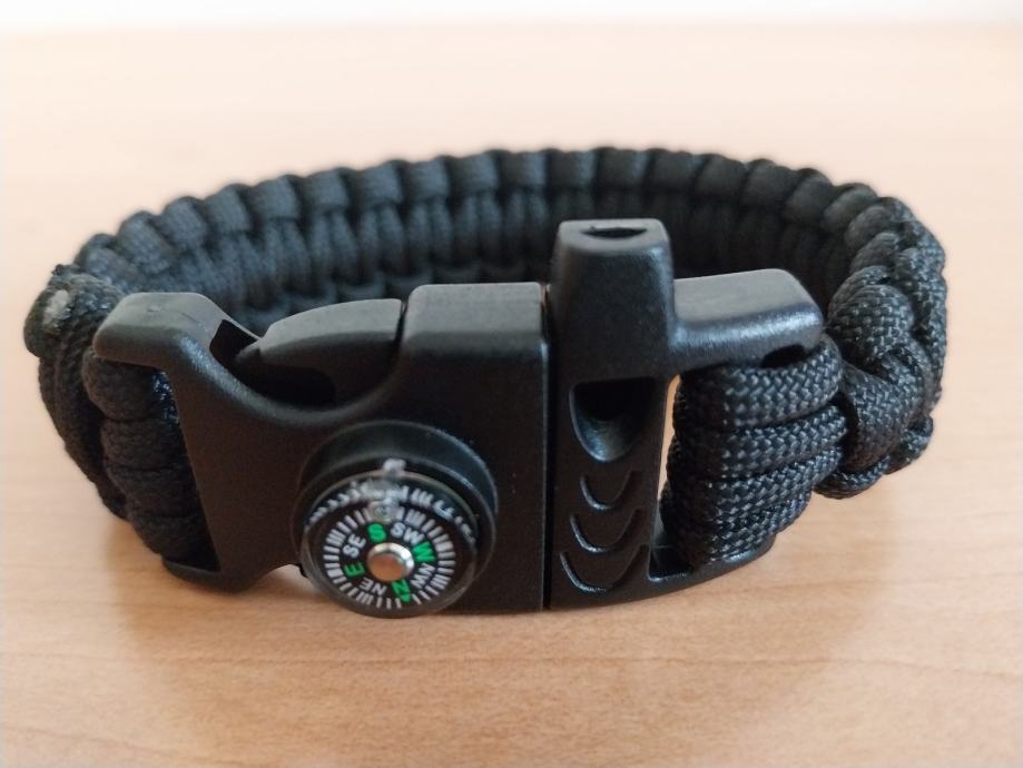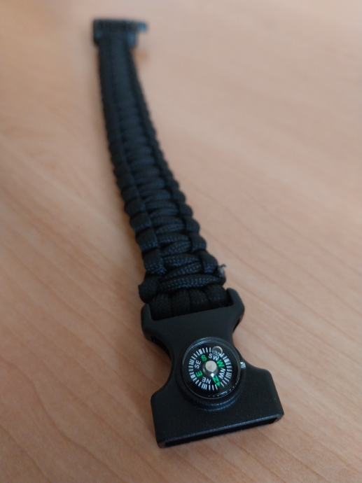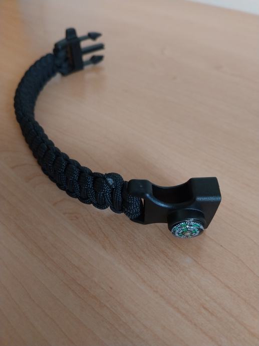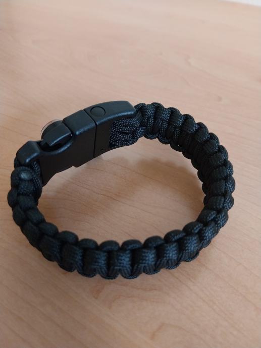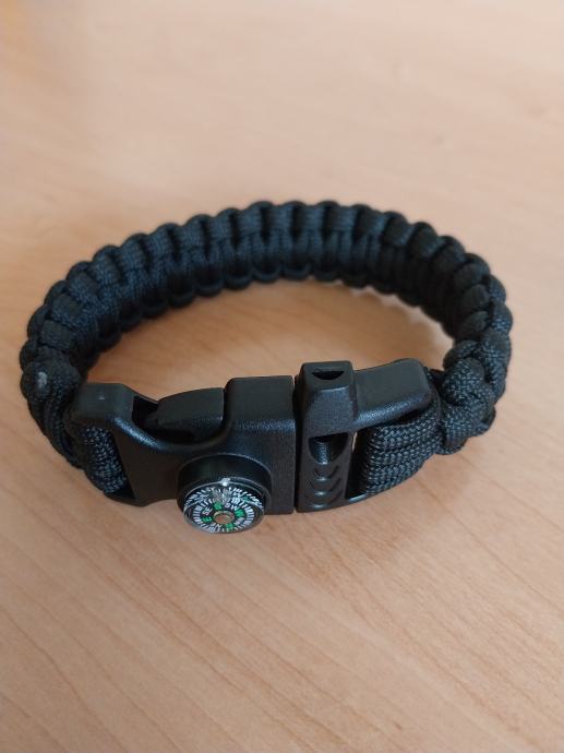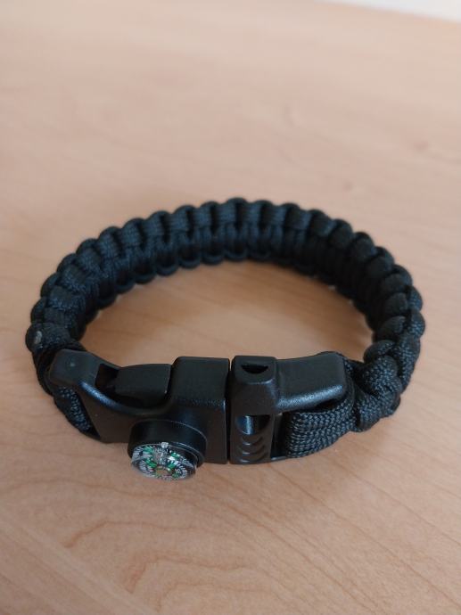 Crna narukvica za preživljavanje u prirodi, novo stanje bez etikete. Izrađena od čvrstog paracord konopa s praktičnim dodacima poput kompasa i kopče za hitne situacije. Savršen modni dodatak za ljubitelje outdoor aktivnosti i pustolove koji cijene funkcionalnost. Dužina 25 cm.