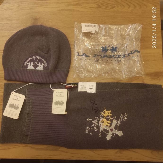 Prodajem novi šal i kapu La martina u kombinaciji sivo ljubičaste boje.