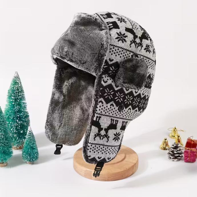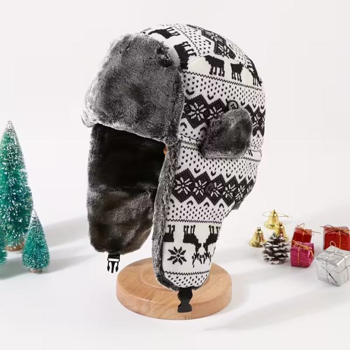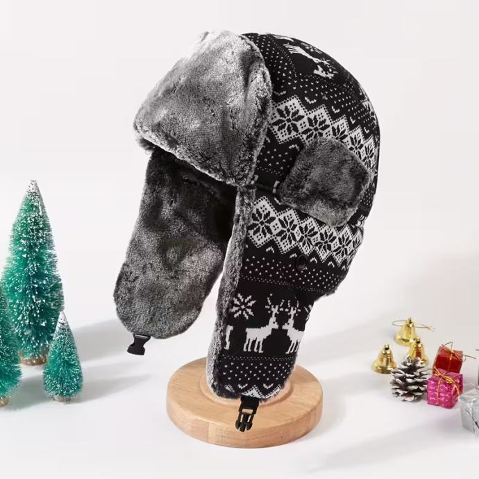 Zimska termalna flisom podstavljena vjetrootporna kapa s ušima - uniseks dizajn s printom sobova i pahuljica, poliesterska vanjska kapa za muškarce i žene, ručno periva kapa za hladno vrijeme