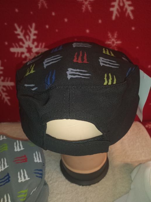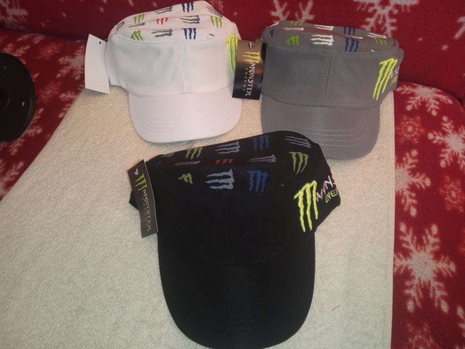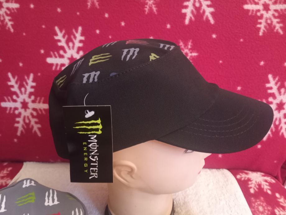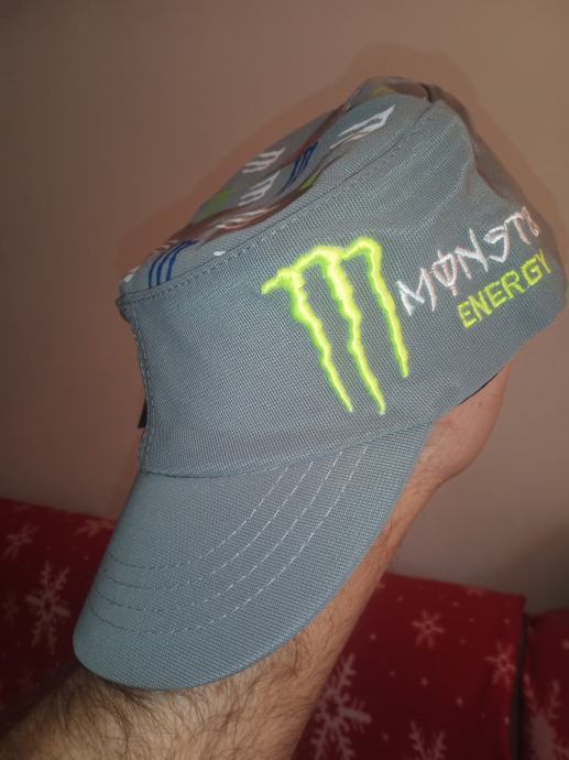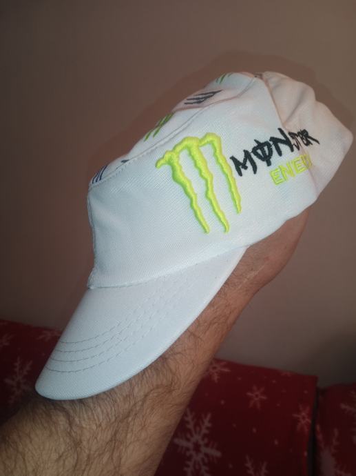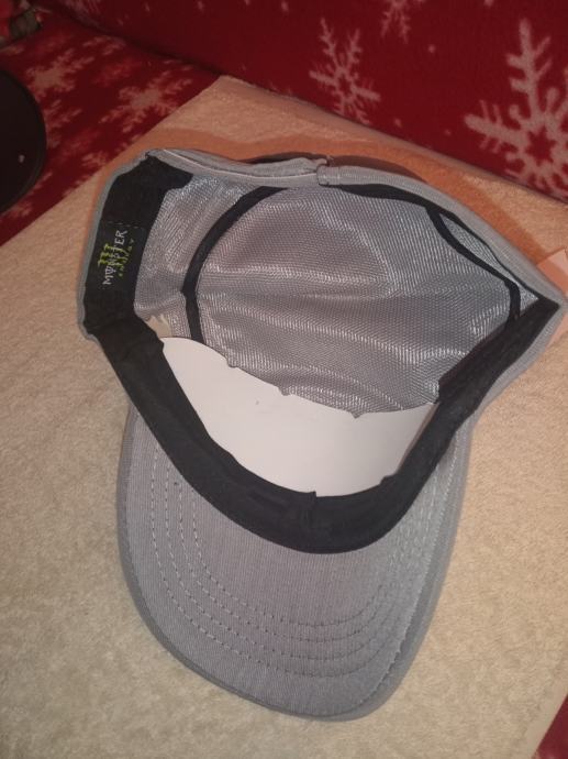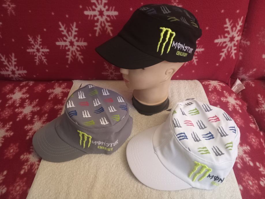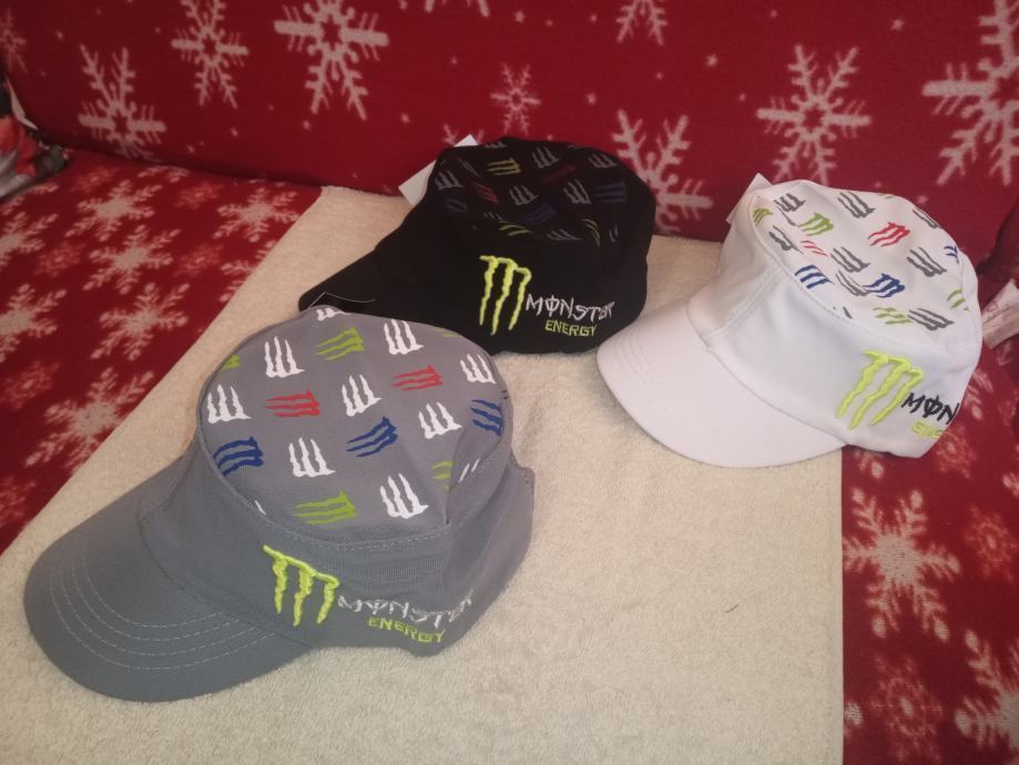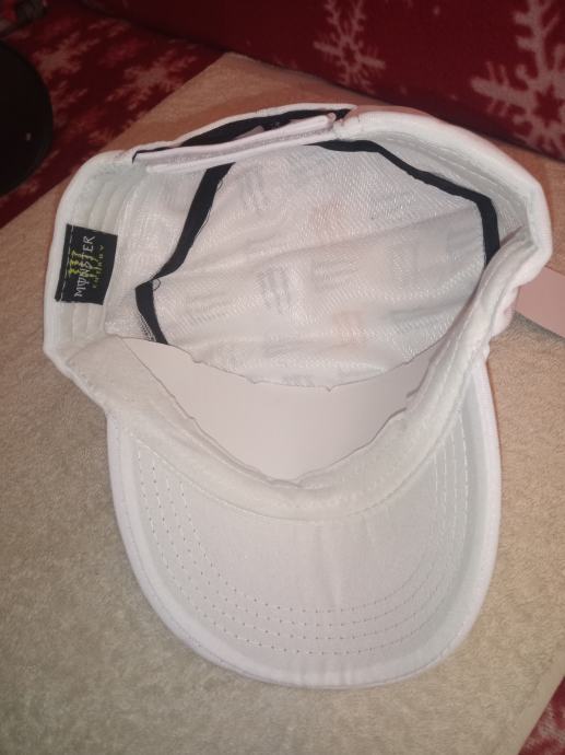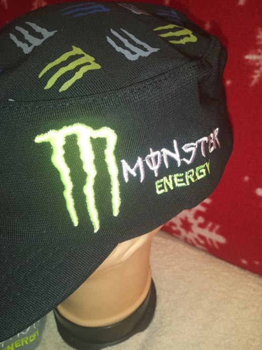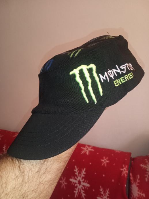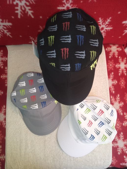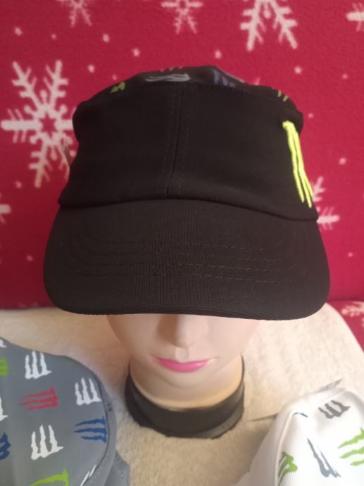 Crna,siva i bijela print na vrhu kape bočno floroscentni logo Monster Energy vezen koncem