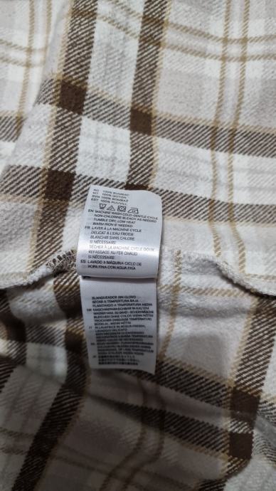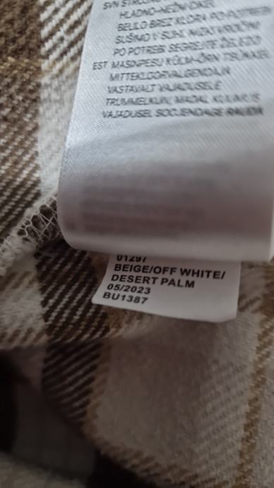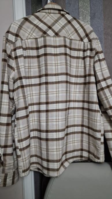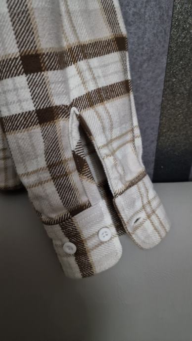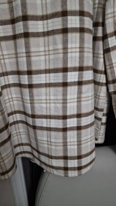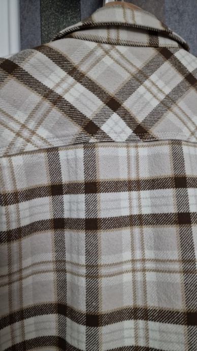 Materijal je posebno, mekani česljani flanel, klasičnog kariranog dezena, bež/ smeđe nijanse. Dva prednja džepa, nestrukirana, zaobljenog donjeg ruba.