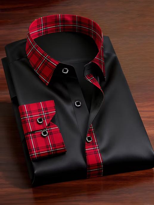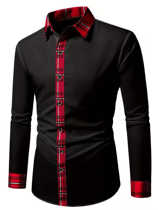 Muška košulja otporna na gužvanje, brzosušeća - crveno-crni tartan karirani uzorak, uski kroj s X-izrezom, periva u perilici rublja za sva godišnja doba i svečana odjeća - teški 120 g/m² poliester poslovno odijelo s kopčanjem na gumbe, muška košulja, muška košulja, muška košulja, muške košulje, košulje za muškarce, svečane košulje za muškarce, muške košulje