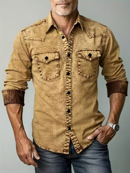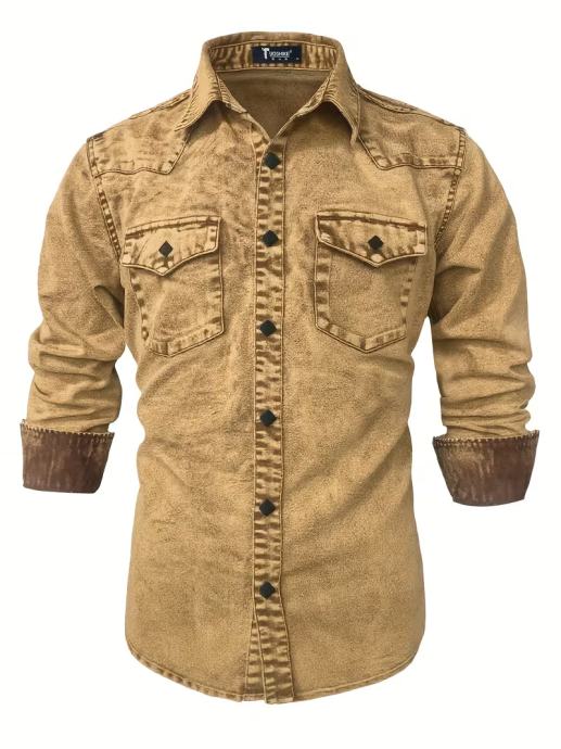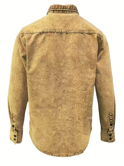 Muška traper košulja dugih rukava u vintage stilu, s dvostrukim džepovima na prsima i ovratnikom. Ležerna košulja neophodna za jesen i zimu, izrađena tehnikom pranja i s četvrtastim gumbima, savršena za slojevito nošenje.