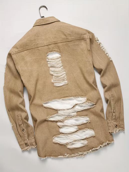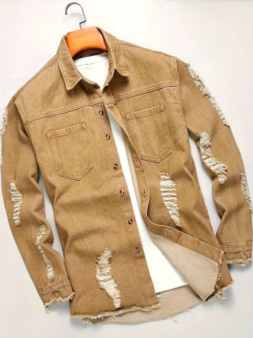Muška traper košulja s pohabanim detaljima - opušteni kroj s poderanim detaljima, klasični ovratnik i kopčanje na gumbe sprijeda, ležerna gornja odjeća za jesen/zimu, jesenska moda, jednobojni dizajn