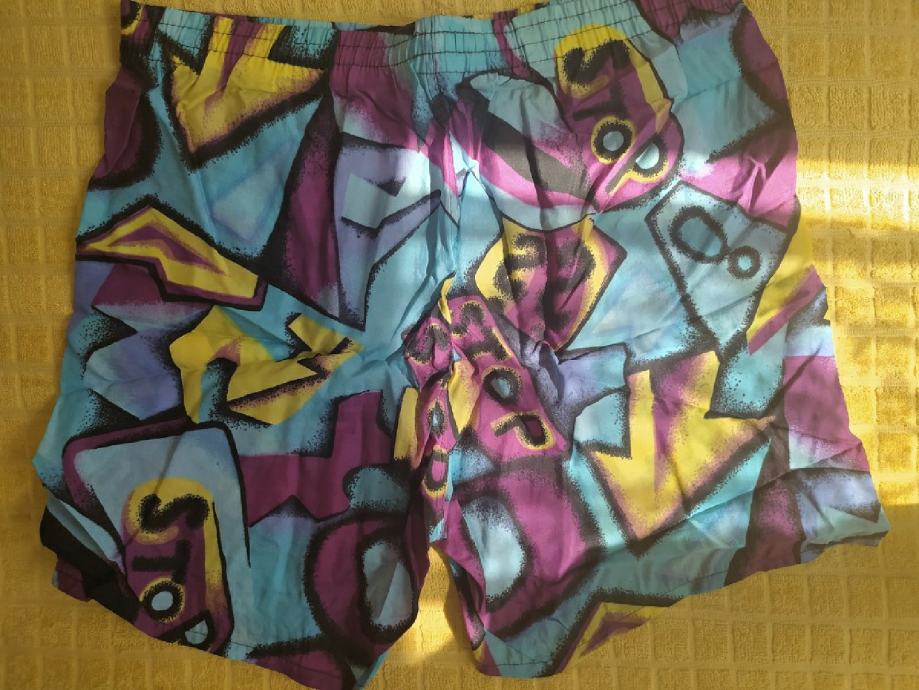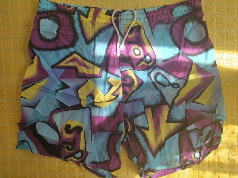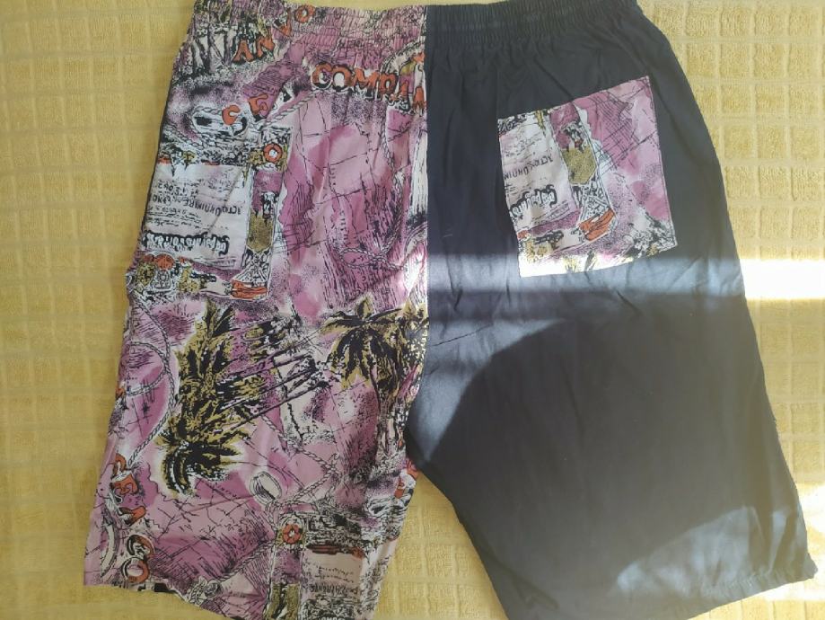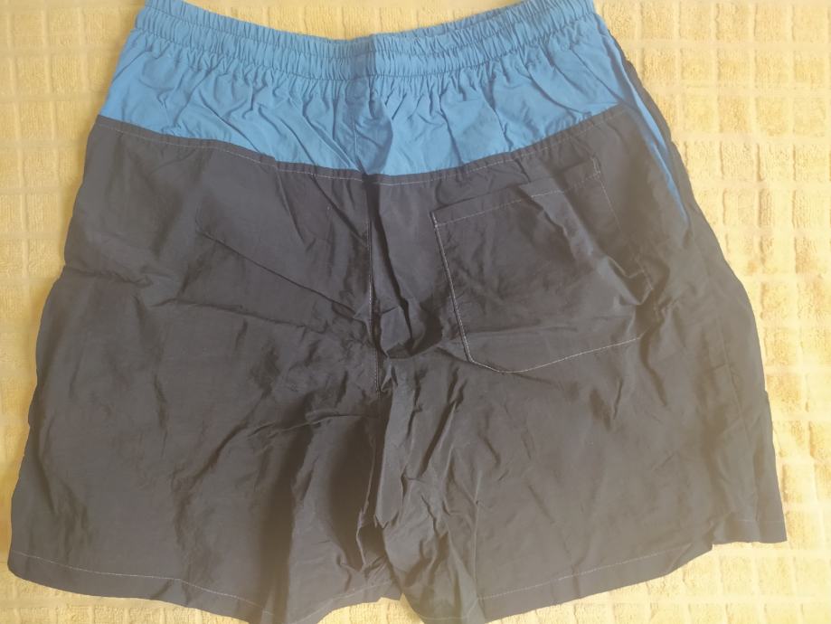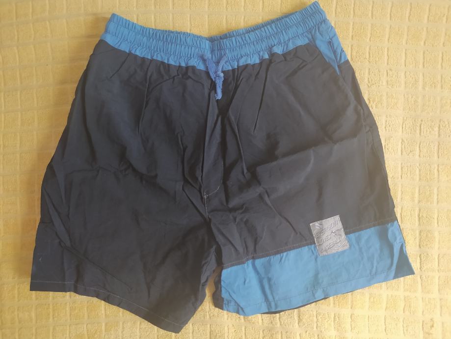 7. Hlače kratke "Plavo ljubičaste" vel L. Plavo ljubičsta žuta boja. Za nositi van, za po doma, priroda, plaža. Džepove nema. Mogu biti i kao kupaće radi "šuškavog" materijala". Stanje odlično . Struk 42cm (u zategnutom stanju - rastezljiva guma), dužina 43cm, nogavice 30cm.