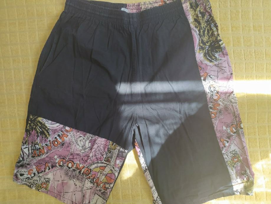 2. Kratke hlače "Crne" vel L. Crne pamučne hlače. Za nositi van, za po doma, priroda, plaža. Jedan "Pravi ljetni uzorak" crna podloga s ljetnim motivima palmi, plaža,,. Stanje ispravno. Struk 26cm (u zategnutom stanju - rastezljiva guma), dužina 53cm, nogavice 29cm.