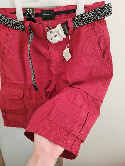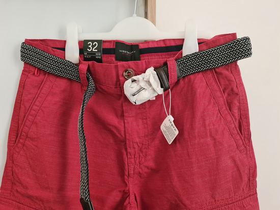 Westbury Premium C&A kratke hlače od kvalitetnog pamuka. Imaju bočne džepove te džepove naprijed i iza. Dolaze s remenom. Označena veličina 33, Eur 46/48, neki manji L rekla bih. Dolaze s remenom. Novo, s etiketom. Boja je još bolja uživo nego na fotkama jer je manje intenzivna. Nažlost, kupili smo male i zagubili račun po stoje. Plaćene 250 kn.