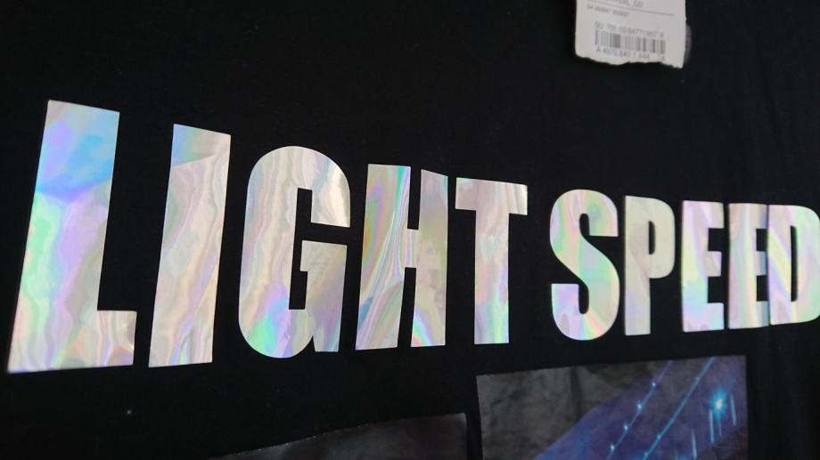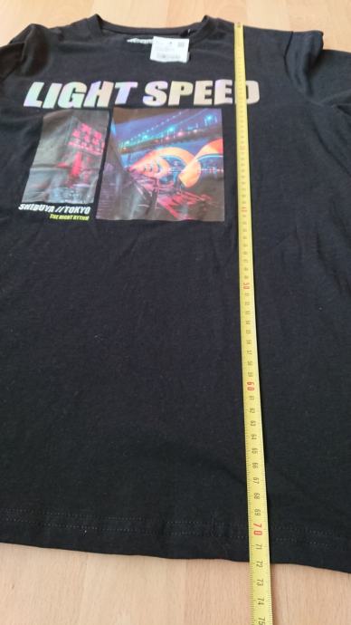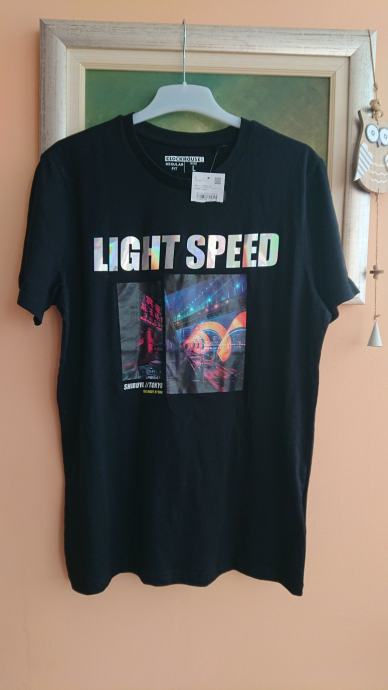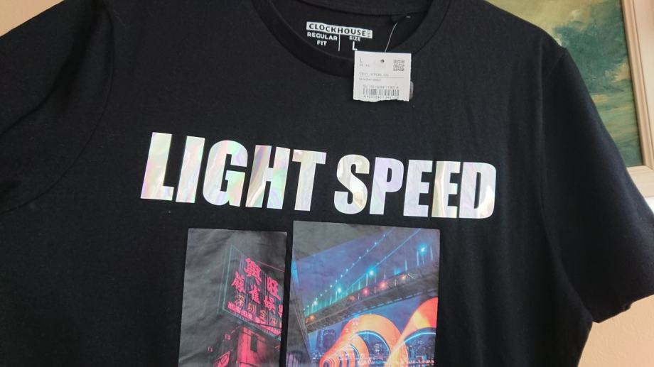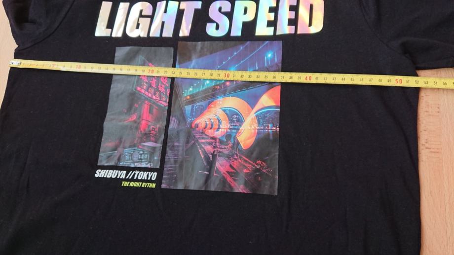 Crna muška majica vel. L, NOVO, sa etiketom, super za poklon, sa natpisom LIGHT SPEED koji se presijava (vidjeti treću sliku), Tokyo, the night rythm, dužina cca 72cm, širina cca 52cm (vidjeti zadnje dvije slike za mjere).