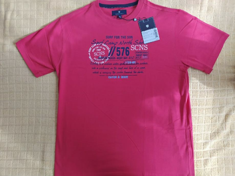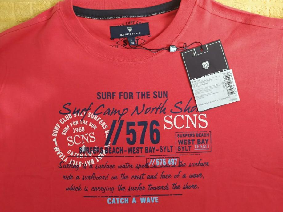 Majica " Basefield" vel L nova, crvena boja s natpisom na prednjoj strani. Dopadljiva majica za ljetne dane. Nova nikad nošena stoju u ormaru. Majica je iznadprosječene kvalitetne tkanine. Dužina 72cm, širina 55cm, ramena 49cm.