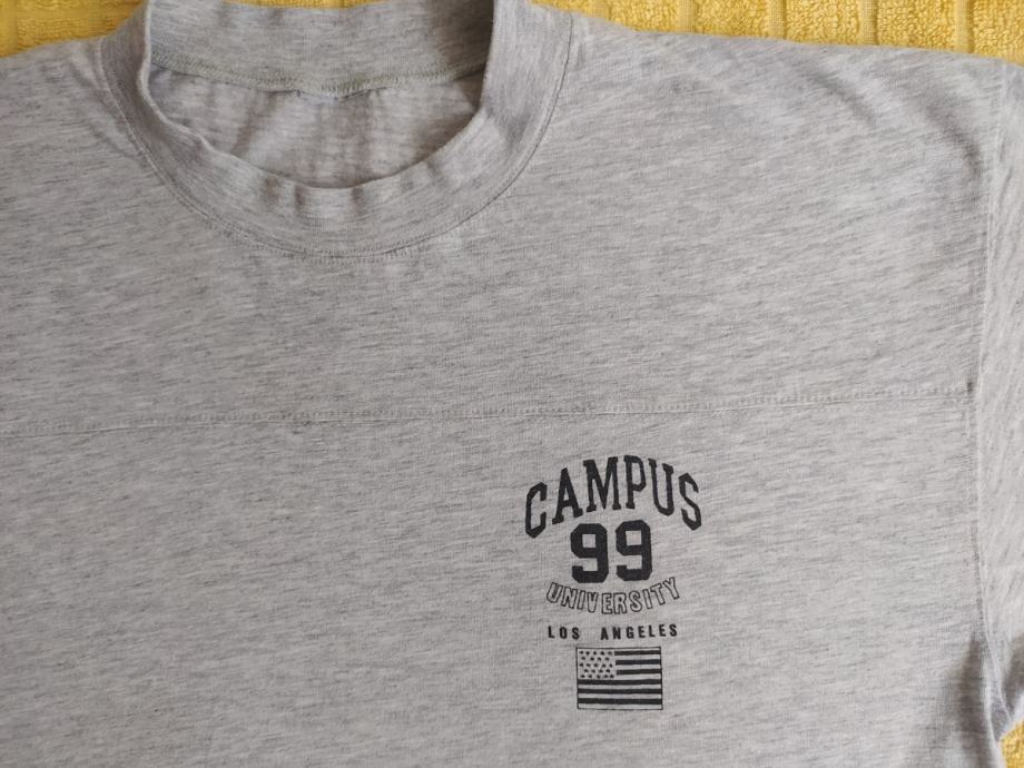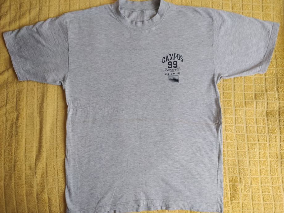 Majica "Campus 99" vel M, jednobojna sivkasta s crnim natpisom na prednjoj strani. Stoji već neko vrijeme u ormaru, nije nošena. Po sredini ima smeđkastu liniju (slika 3), nije se opralo u mašini.. Dužina 69cm, širina 52cm, ramena 50cm.