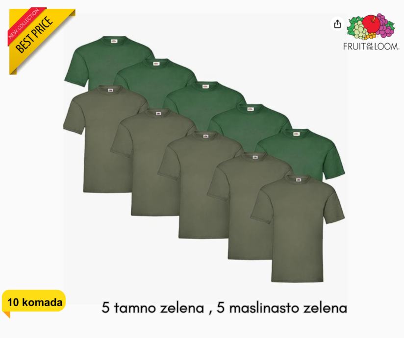 Set od 10 Fruit of the loom majica : 5 Tamon Zelenih , 5 Maslinasto zelenih, heavy cotton pruža vrhunsku vrijednost s visokokvalitetnim pamukom koji je mekan i udoban za nošenje. Klasičan kroj majica prilagođava se različitim postavama, nudeći potpunu udobnost tijekom cijelog dana.
