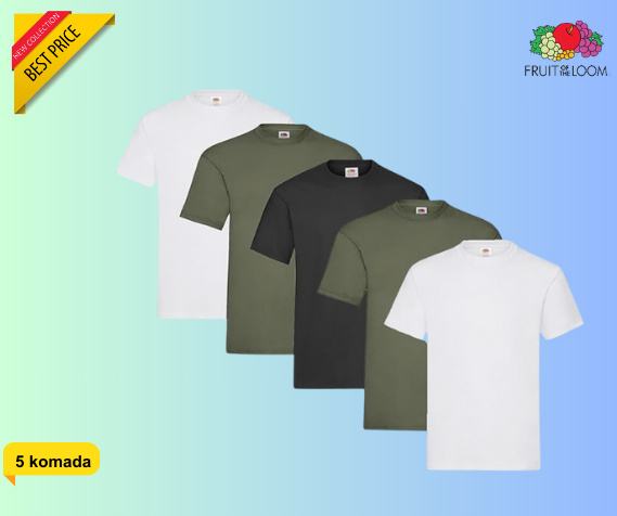 Set od 5 Fruit of the loom majica dvije bijele , dvije maslinaste i jedna grafit, heavy cotton pruža vrhunsku vrijednost s visokokvalitetnim pamukom koji je mekan i udoban za nošenje. Klasičan kroj majica prilagođava se različitim postavama, nudeći potpunu udobnost tijekom cijelog dana.