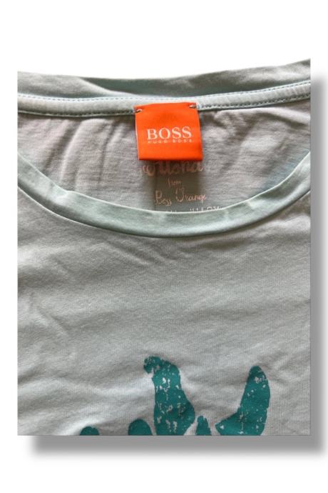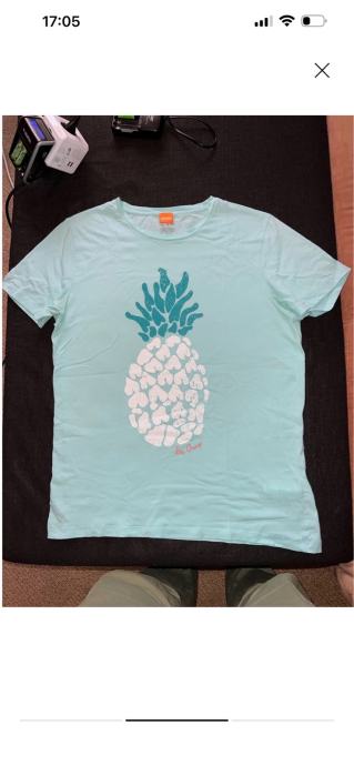 Prodajem mušku majicu kratkih rukava Hugo Boss Orange, veličine M. Radi se o modelu s okruglim izrezom i grafičkim printom ananasa na prednjoj strani. Majica je lagana i udobna, pogodna za toplije dane.