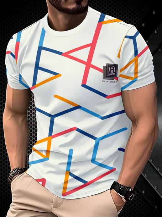 Muška modna majica s 3D printom, regularni kroj, kratki rukavi, okrugli izrez, prozračna ljetna ležerna odjeća, majica koja se može prati u perilici rublja, udobna tkanina, ulični stil, moderan dizajn, muška majica s geometrijskim printom, bijelo-plava, muška majica, majica za muškarce